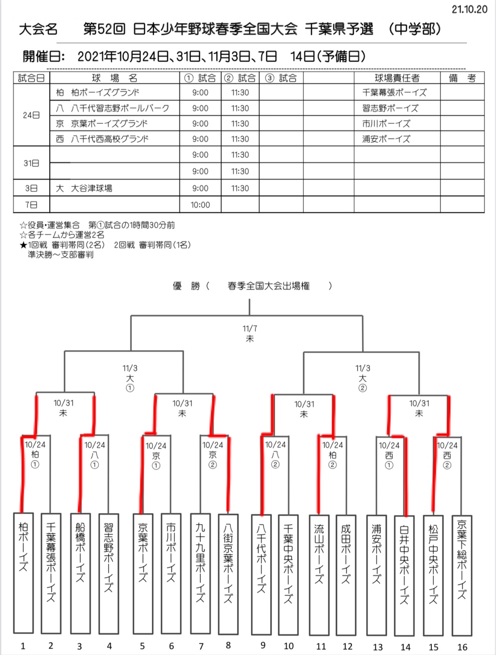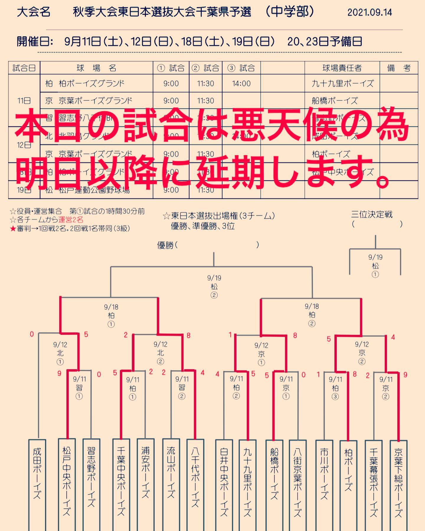 秋季大会東日本選抜大会千葉県予選、本日の予定は悪天候のため延期となりました。