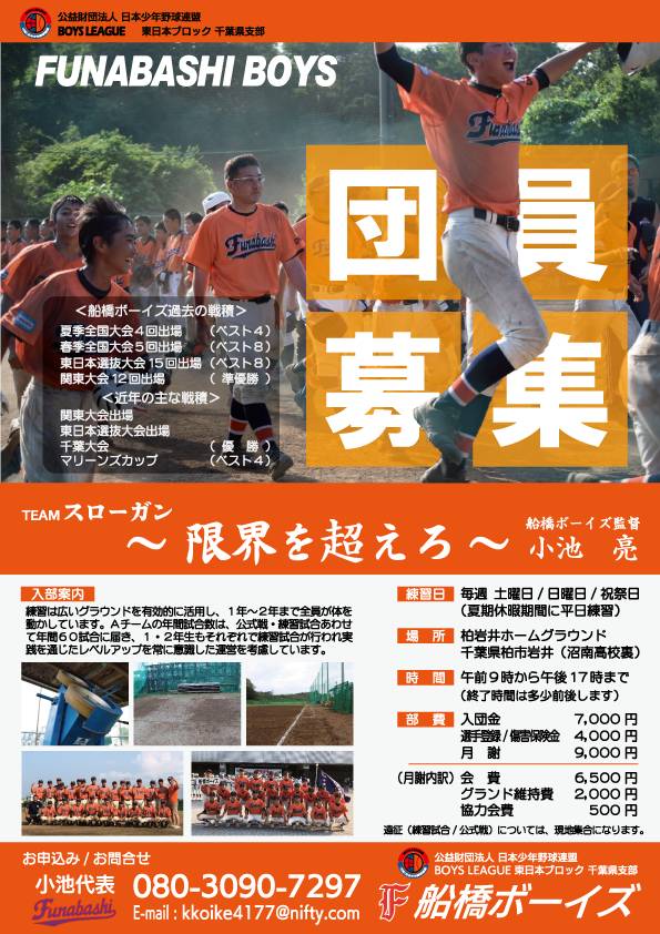 | 月謝 | 9,000円 (内訳) 会費:6,500円 グランド維持費:2,000円 協力会費:500円 |